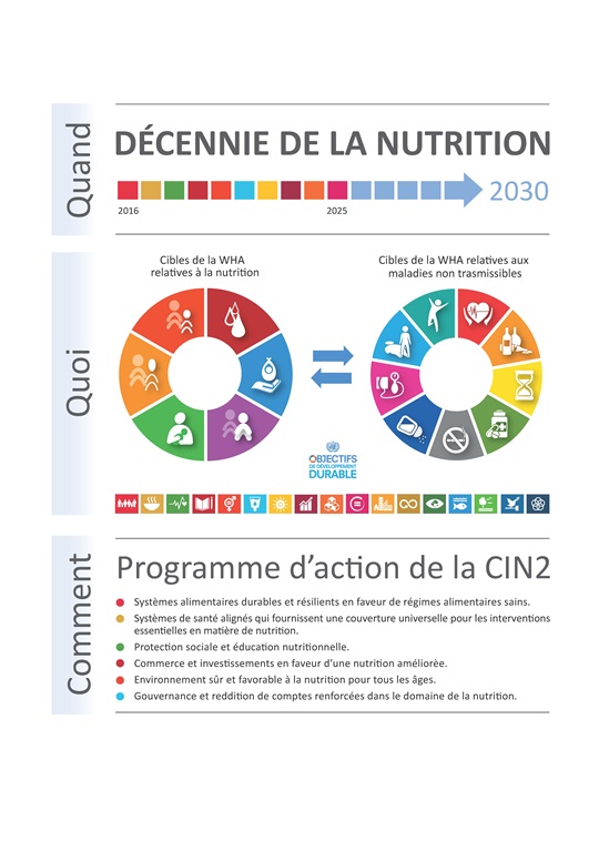 Ce travail est encadré par le Plan d’application exhaustif concernant la nutrition chez la mère, le nourrisson et le jeune enfant, adopté par les États Membres en vertu d’une résolution de l’Assemblée mondiale de la Santé en 2012. Les mesures visant à mettre fin à la malnutrition sont également essentielles pour atteindre les objectifs liés à l’alimentation énoncés dans le Plan d’action mondial pour la lutte contre les maladies non transmissibles 2013-2020, dans la Stratégie mondiale pour la santé de la femme, de l’enfant et de l’adolescent (2016-2030), dans le rapport de la Commission pour mettre fin à l’obésité de l’enfant (2016) et dans le Programme de développement durable à l’horizon 2030.